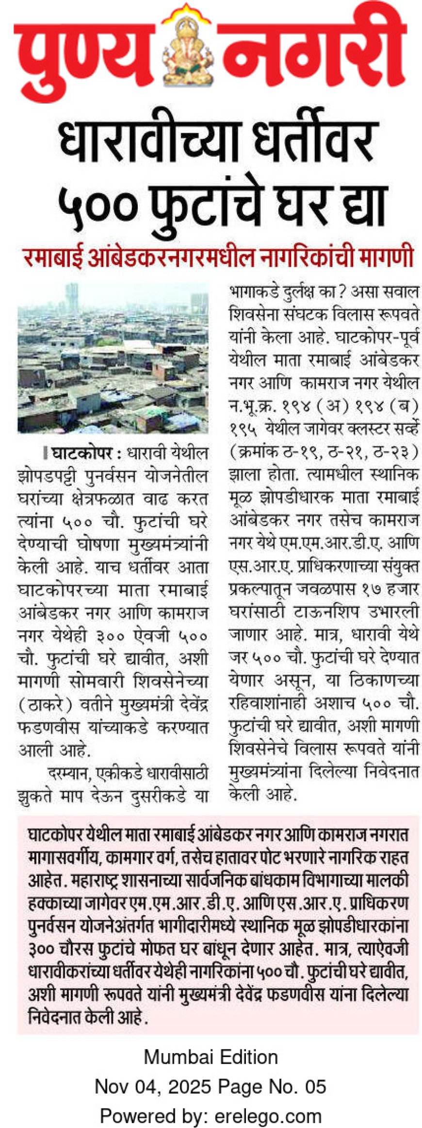 “जर सरकारला खरंच मागासवर्गीय आणि कष्टकरी वर्गावर प्रेम असेल, तर धारावीप्रमाणेच माता रमाबाई आंबेडकर नगर, कामराज नगर आणि मुंबईतील सर्व झोपडपट्टीतील नागरिकांनाही 500 चौ.फुटांचे घर द्यावे. हेच समानतेचे आणि न्यायाचे खरे उदाहरण ठरेल,”